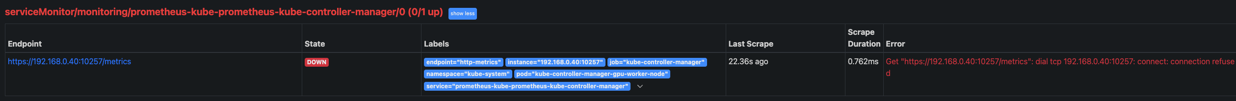 - 정상 (0.0.0.0:10257 또는 127.0.0.1:10257으로 리슨 중) → Prometheus 접근 문제일 가능성 큼.