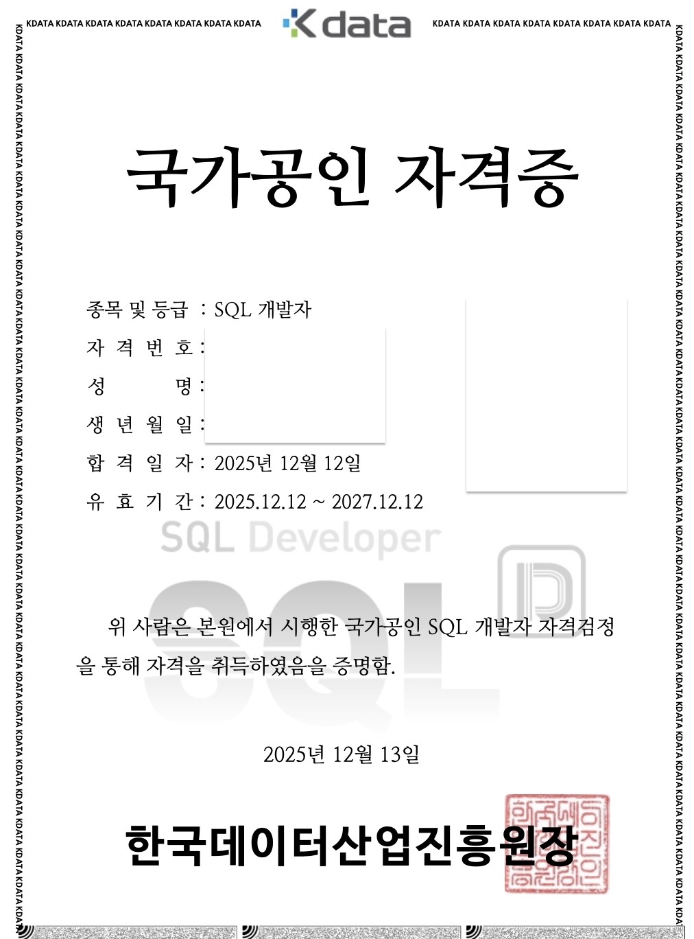 제가 준비하고 취득한 자격증은 SQLD(SQL Developer) 입니다.