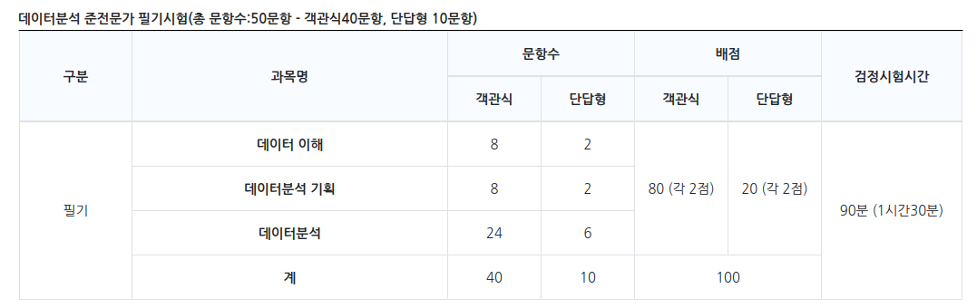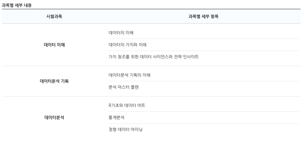 시험 과목은 총 3과목으로 구성되어 있으며 데이터 이해 과목을 바탕으로 데이터를 분석하는 능력을 검정합니다. 자세한 내용은 아래표를 참고하면 좋습니다!