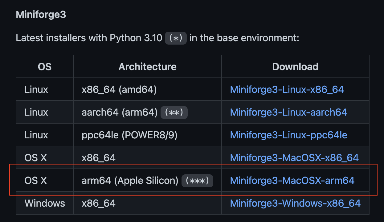 1. 다음 링크에서 들어가서 Miniforge3 arm64 버전을 다운로드 하시거나, 여기를 눌러 다운로드합니다.