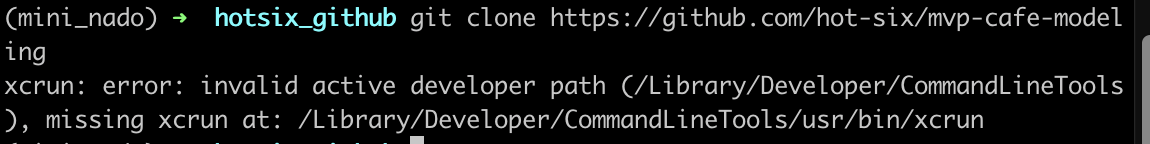 에러 내용 : xcrun: error: invalid active developer path (/Library/Developer/CommandLineTools), missing xcrun at: /Library/Developer/CommandLineTools/usr/bin/xcrun