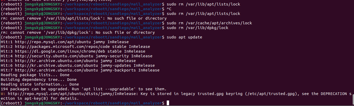 이 오류는 lock 파일을 삭제하는 방법으로 해결 가능하다.