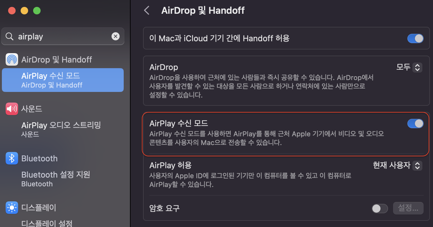 ( 시스템 설정 - airplay 검색 - Airplay 수신모드 끄기)