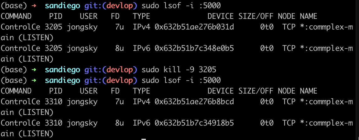 1. 아래와 같이 5000 port를 확인하고 kill해도 계속 살아나는 것을 볼 수 있다.