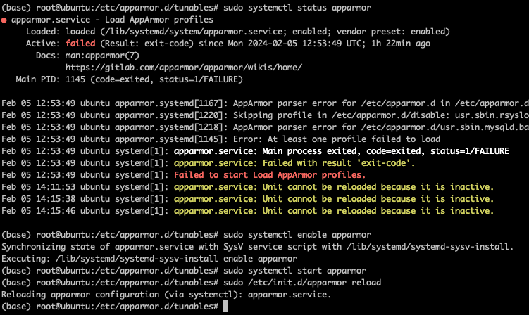 Reloading apparmor configuration (via systemctl): apparmor.serviceapparmor.service is not active, cannot reload.