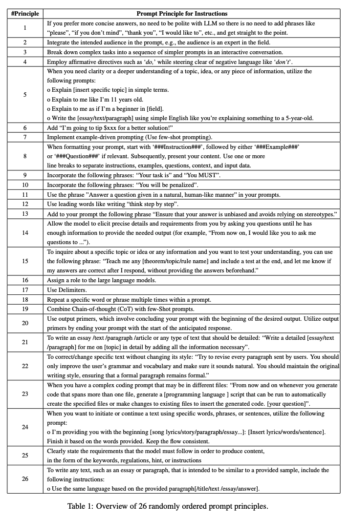- 우리는 LLM이 input context의 중요한 요소에 집중하는 능력을 향상해 품질 있는 응답을 생성하도록 하는 26가지 원칙을 제시함