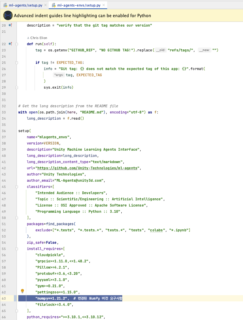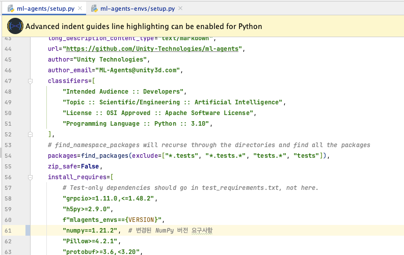 ml-agents-envs/setup.py 에서 numpy 설치 버전 수정하기 (numpy==1.21.2)